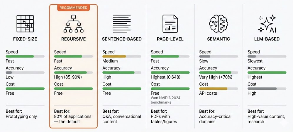 There are six major chunking strategies, each with different tradeoffs. Recursive chunking is the default for good reason — Firecrawl's benchmarks show 85-90% recall at 400-512 tokens. But it's not always the best choice. Page-level chunking won NVIDIA's 2024 benchmarks with 0.648 accuracy. Semantic chunking can improve accuracy by up to 70% according to LangCopilot's testing. Sentence-based splitting outperforms semantic approaches with certain embedding models.
