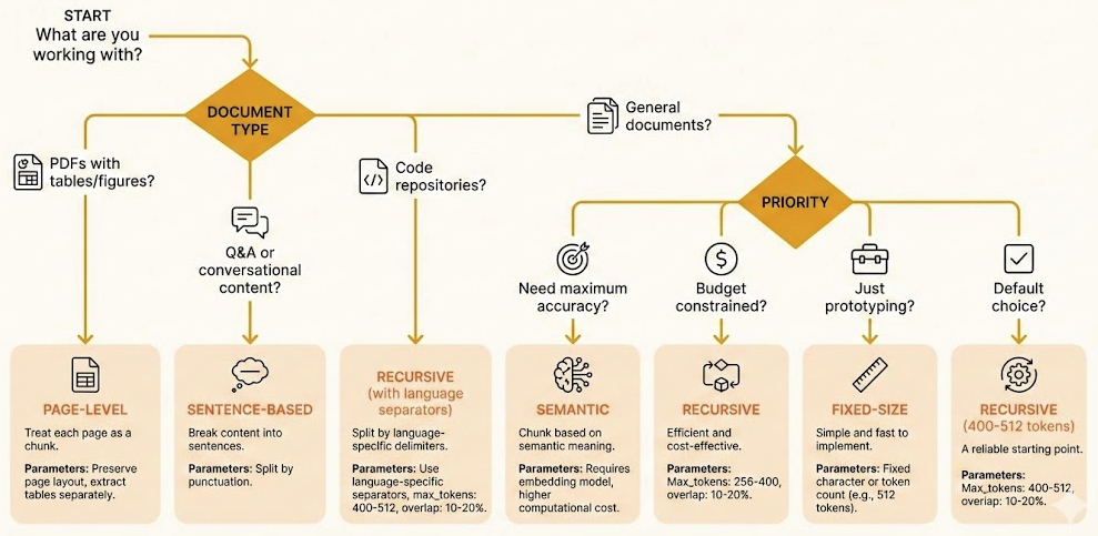 | Just getting started | Recursive (400-512 tokens) | Best balance, fastest iteration |