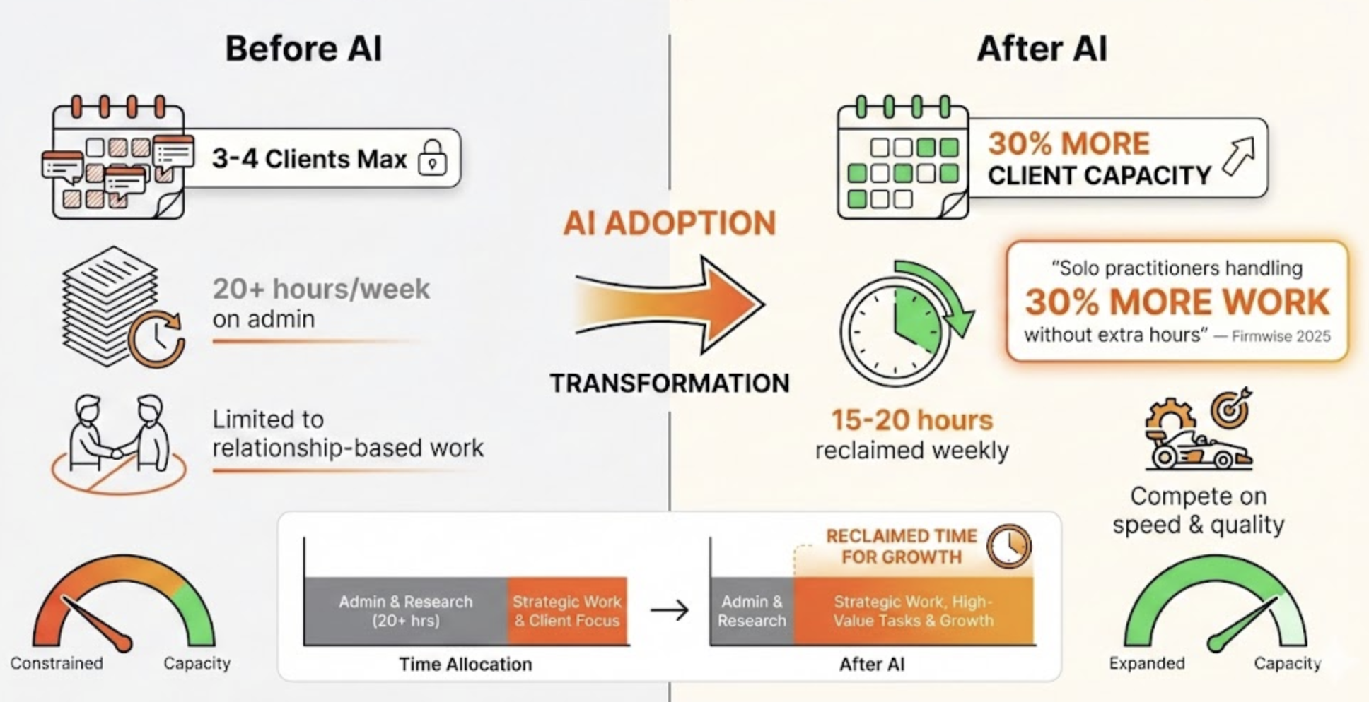 According to Firmwise's 2025 State of the Industry Report, solo practitioners using AI are now handling 30% more client work without adding hours. They're reclaiming 15-20 hours weekly from administrative and analytical tasks — time that used to disappear into research, formatting, and the kind of tedious synthesis that big firms throw bodies at.