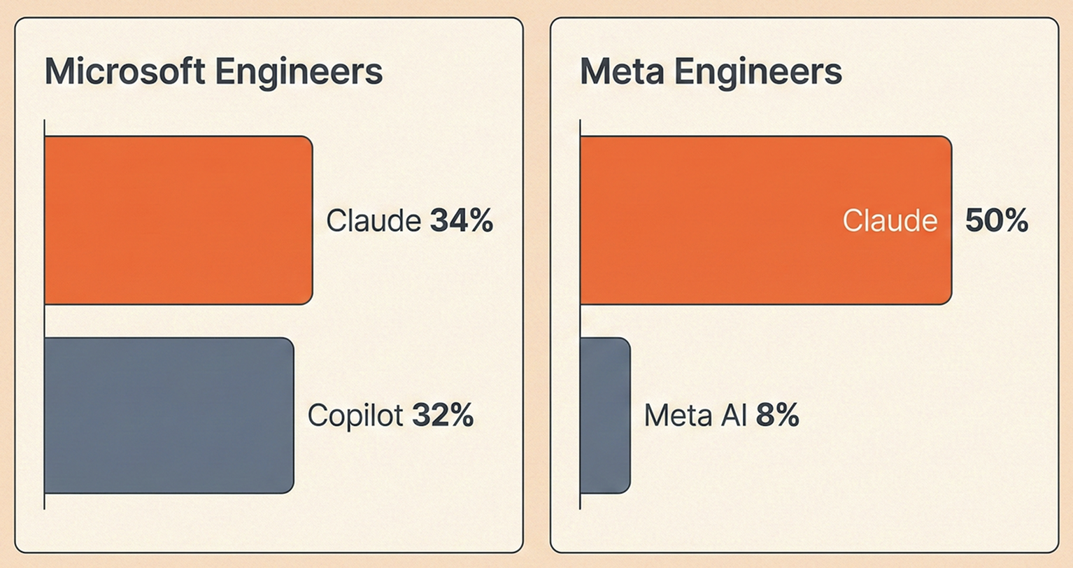 It's not just Microsoft. At Meta, 50% reported Claude as their most-used AI model. Only 8% said Meta AI. At Amazon, 54% chose Claude as their go-to.