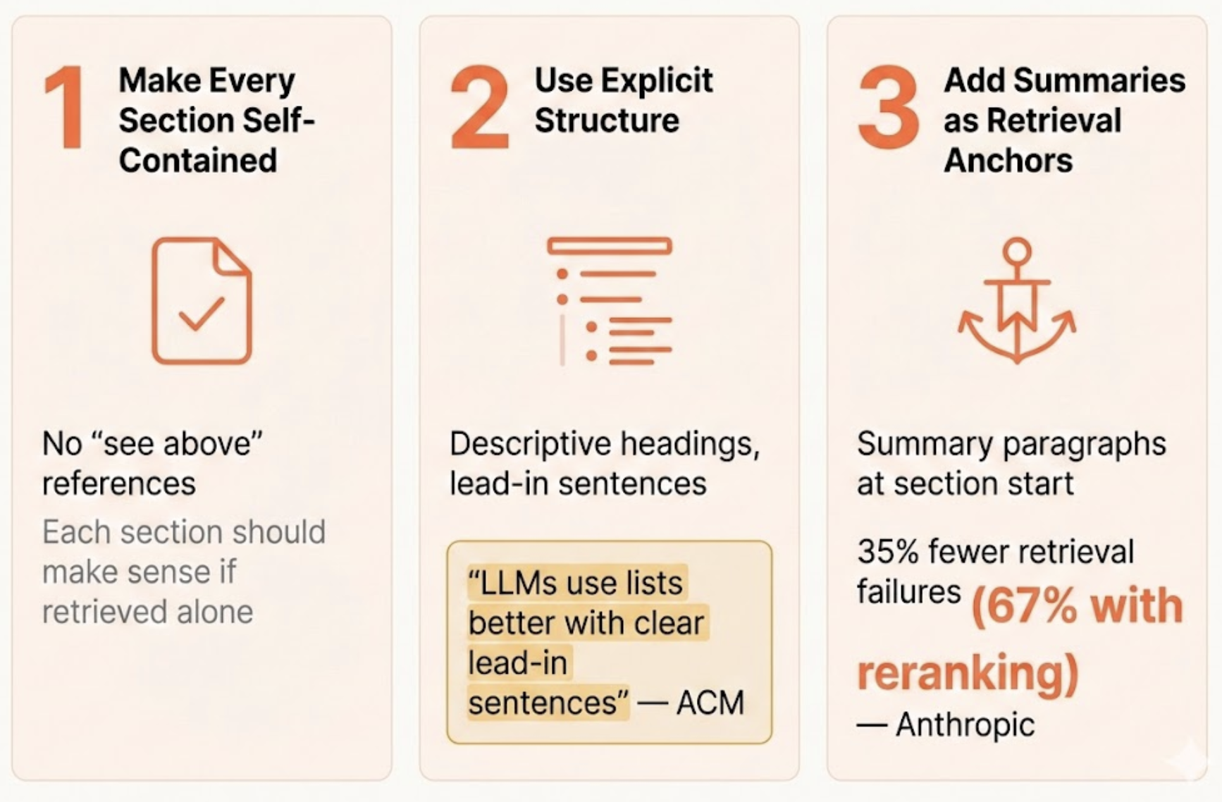 Each section of your document should make sense on its own. Assume the AI will retrieve that section and nothing else—because that's exactly what might happen.
