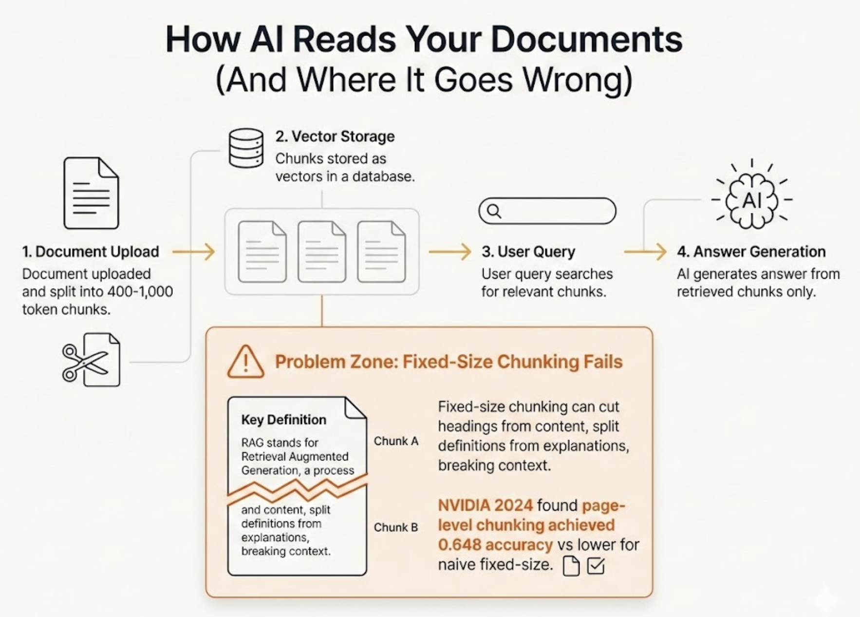 NVIDIA tested seven chunking strategies in 2024 and found that the method mattered enormously—page-level chunking achieved 0.648 accuracy while naive fixed-size approaches scored lower with much higher variance across document types.