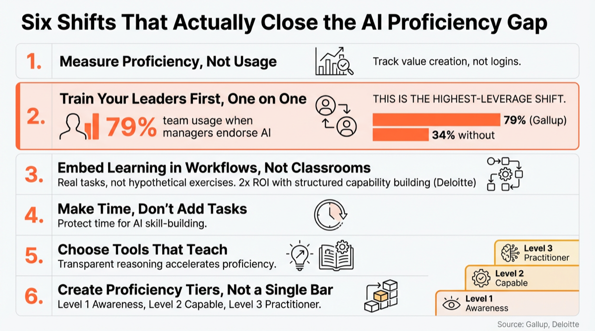 Address the bandwidth trap directly. If you're serious about building AI proficiency across your enterprise, protect time for it.