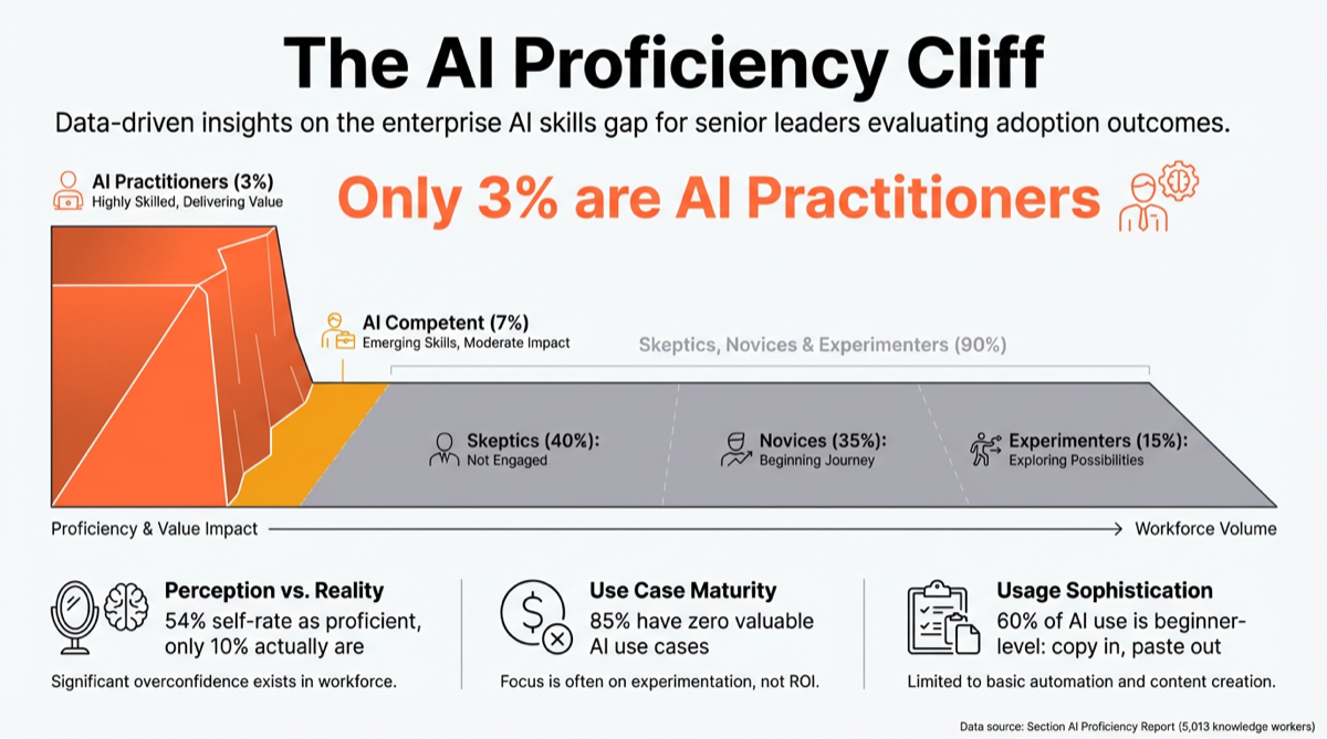 That was an aha moment for me too. Being buried in AI tools all day, I'd become a bit blind to how wide the AI literacy gap in the enterprise workforce actually is. The distance between what these tools can do and what most people use them for surprised me. And the data backs it up: fewer than 3% of knowledge workers qualify as AI proficient, according to the Section AI Proficiency Report. The gap between "has access" and "gets value" is wider than most of us realise.