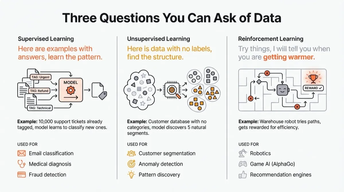 Machine learning isn’t one technique. There are different flavours, and the easiest way to make sense of them is as three different questions you can ask of data.