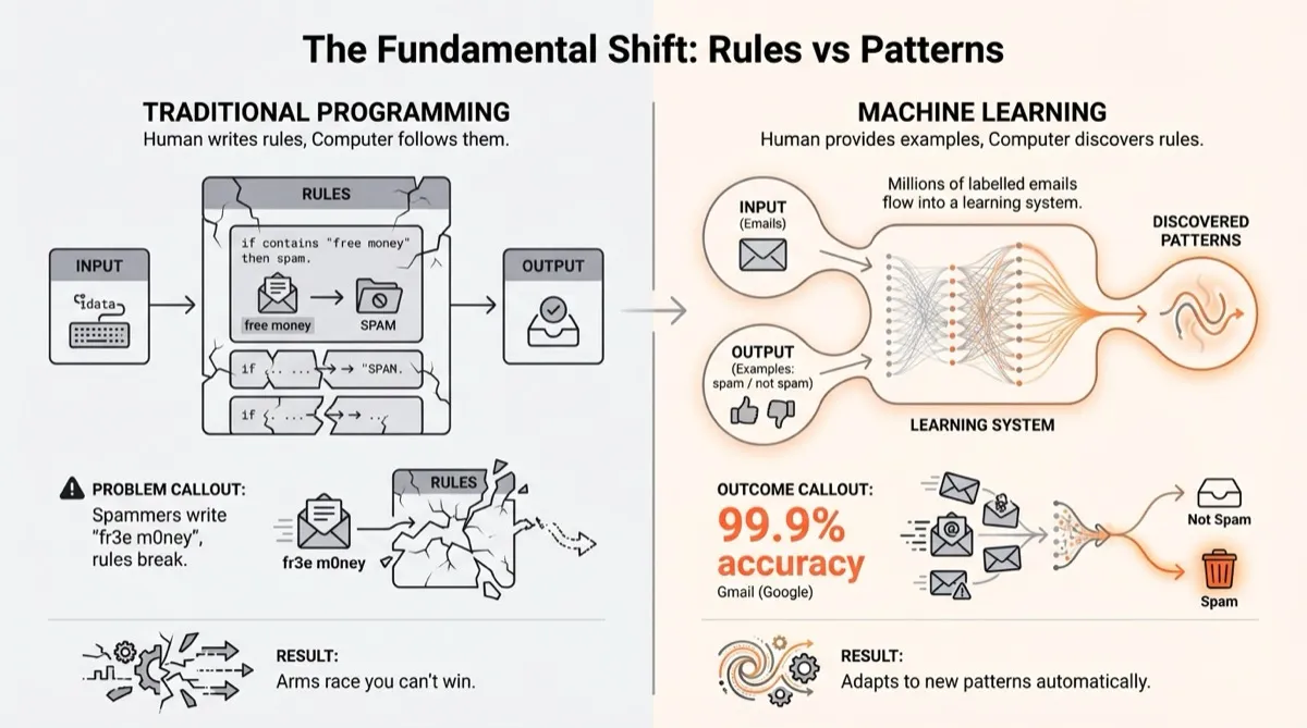 Machine learning takes a completely different approach. Instead of writing rules, you show the system millions of examples. Here are 10 million emails. These ones are spam. These ones aren’t. Figure out the pattern.